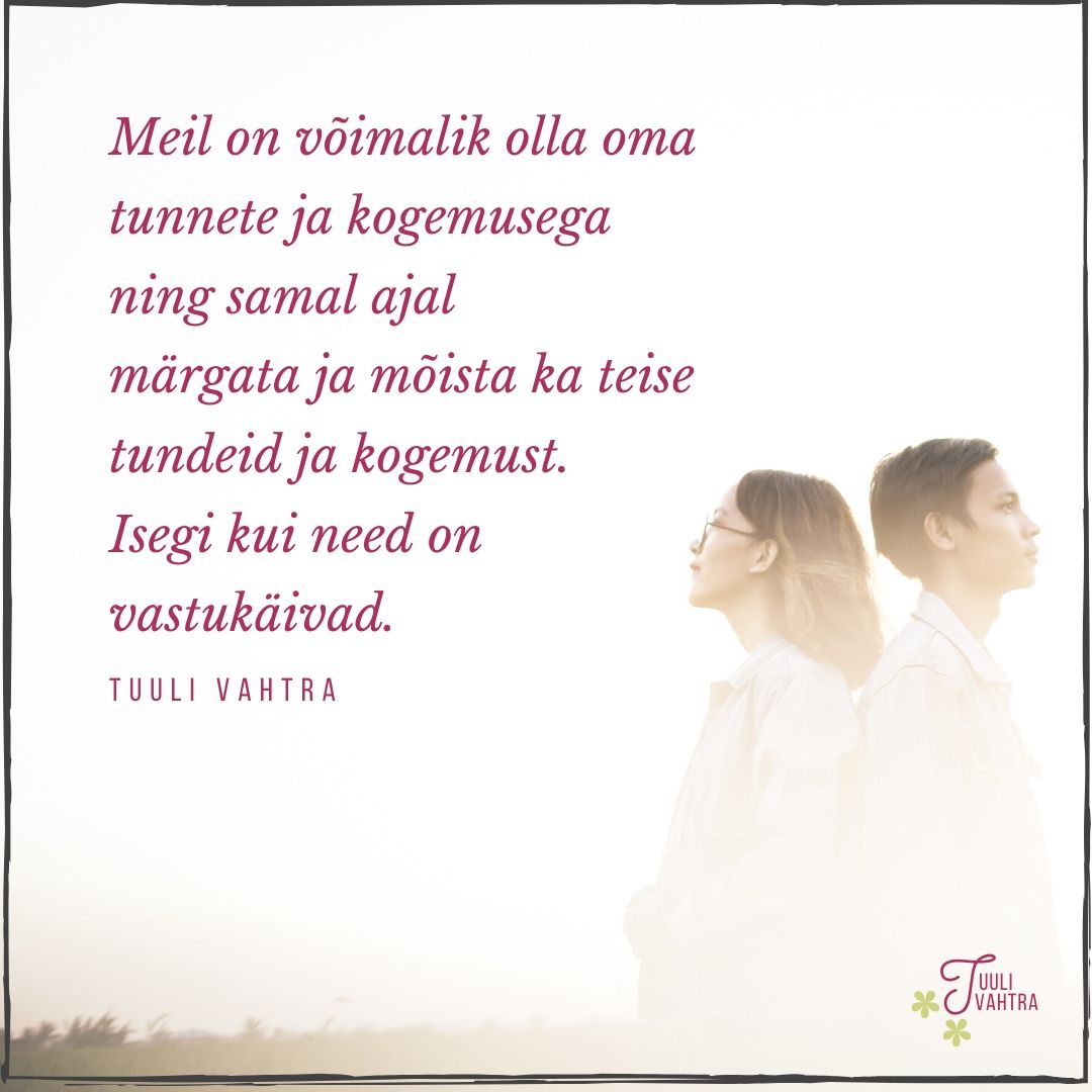 Enda kogemusest loobumist. Teise inimese tajutava reaalsuse nägemine ja kogemuse valideerimine ei tähenda enda tajutavast reaalsusest loobumist. Meil on võimalik hoida ja märgata samaaegselt polaarsuseid. Sama olukord võib sinus tekitada ühtesid tundeid ja reaktsioone (näiteks rõõmustada) ja teises inimeses hoopis midagi vastupidist (näiteks kurvastada). Ja mõlema kogemused ning tunded on teie mõlema jaoks reaalsus. Meil on võimalik olla oma tunnete ja kogemusega ning samal ajal märgata ja mõista ka teise tundeid ja kogemust. Viimast isegi siis, kui need on vastukäivad. Näiteks olles ise rõõmus, võid sa püüda aru saada sellest, kuidas ja miks teine inimene hoopis kurvastab – ja see ei tähenda, et sa peaks oma rõõmust loobuma.